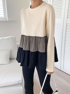 (믹스캉캉티)캉캉 셔링 주름 스트라이프 단가라 긴팔 티셔츠 홈웨어 잠옷