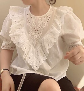 파우더 자수 모티브 레이스 프릴 블라우스