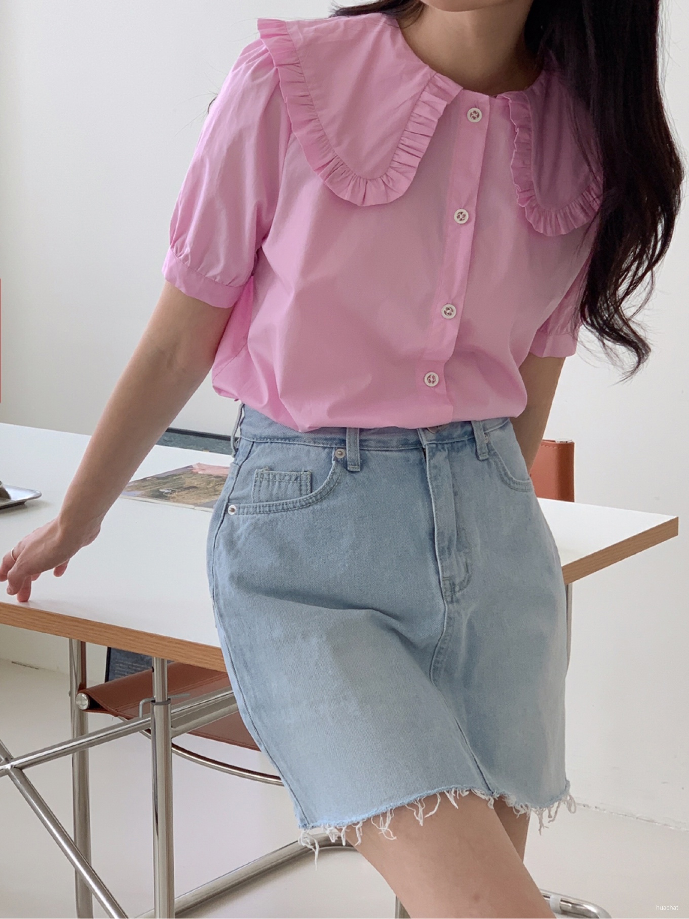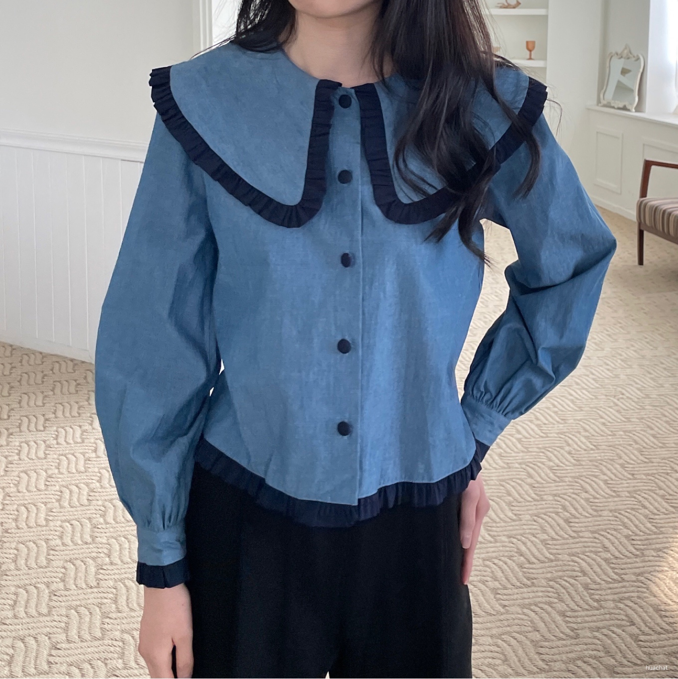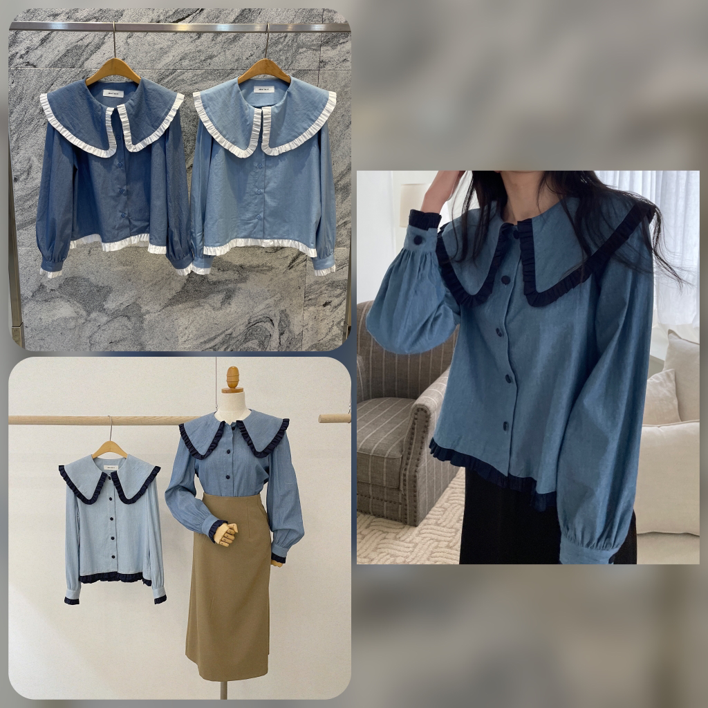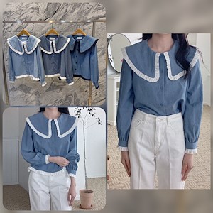 빅카라데님블라우스(세일러BL프릴블라셔링blouse싸게청단추카라코튼)1