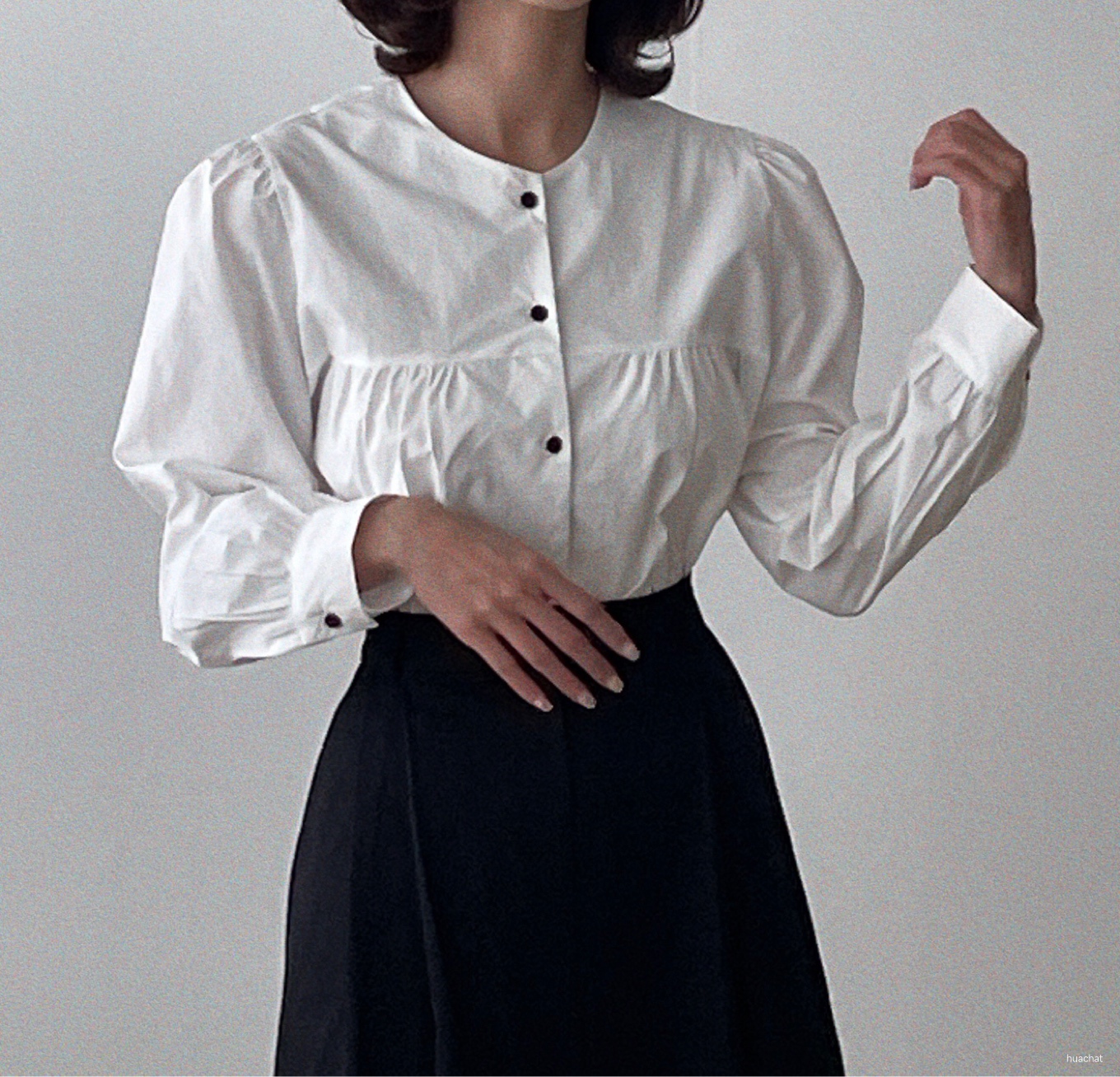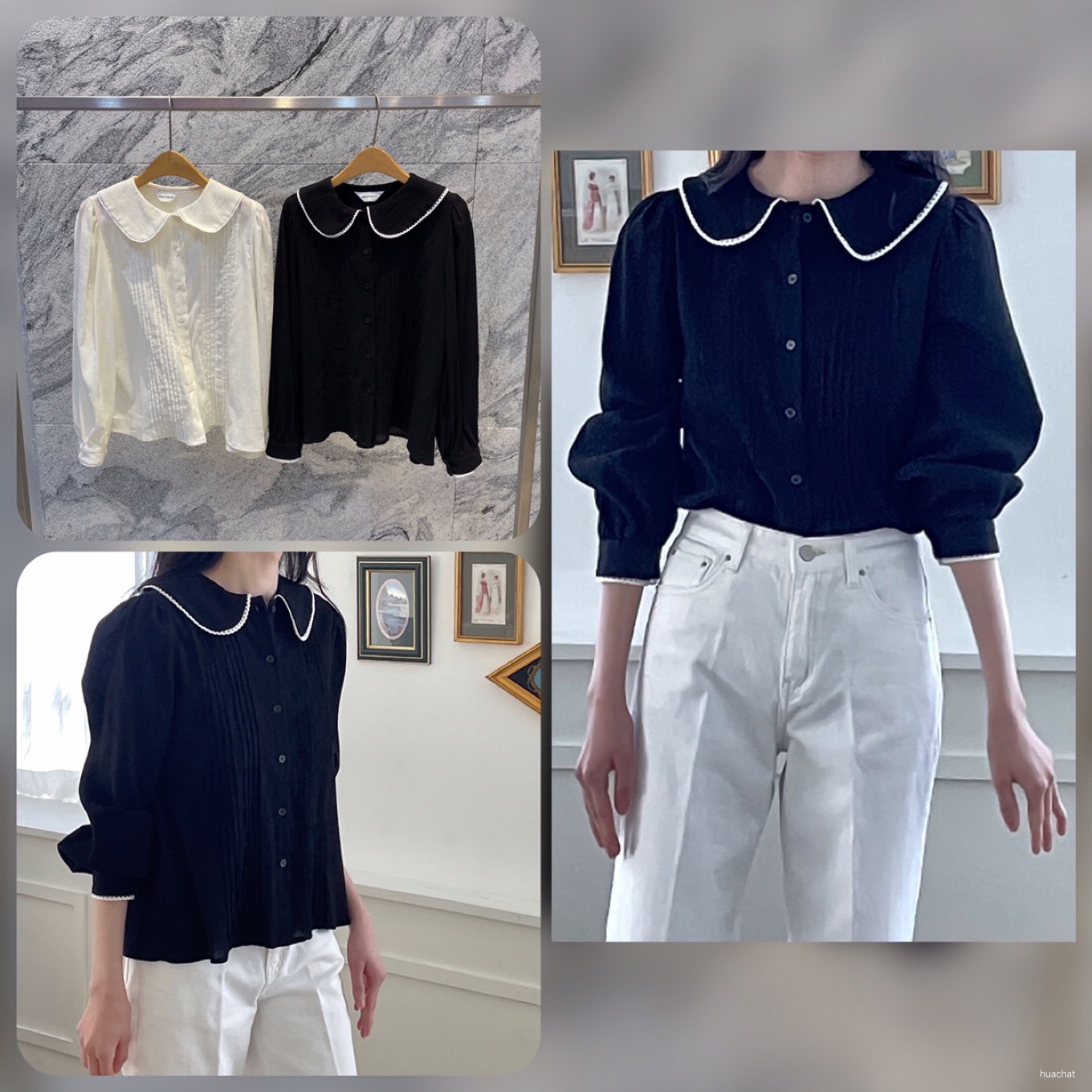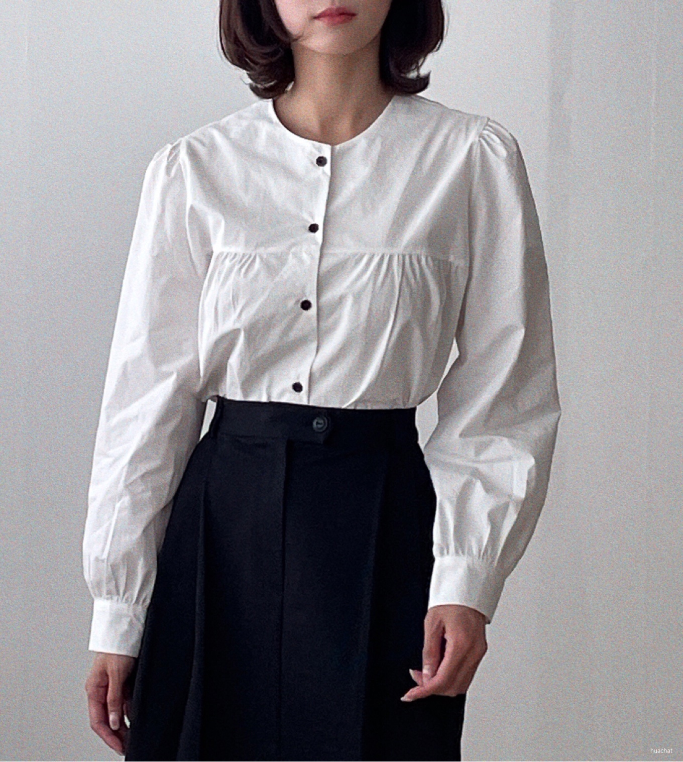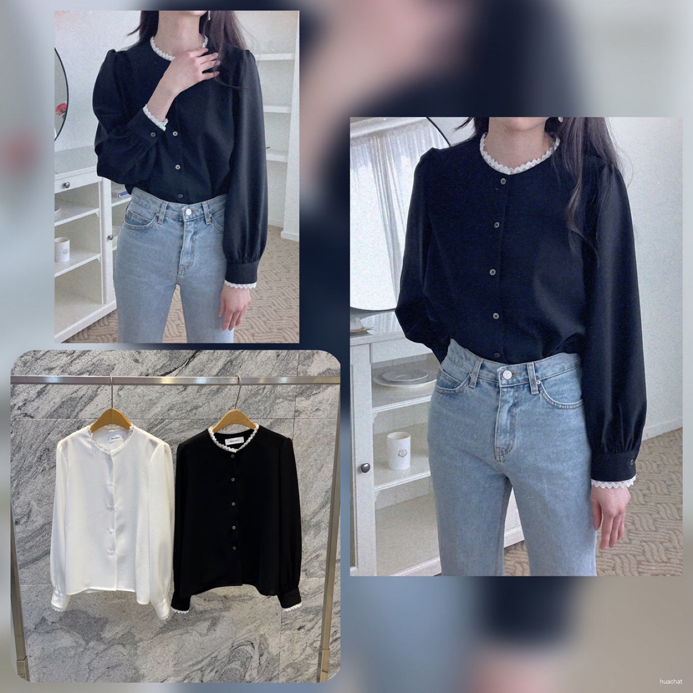 글로리블라우스(라운드하이넥레이스바스락bl배색blouse퍼프흰색검정)1