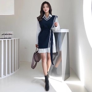 V领毛衣针织连衣裙+条纹斑马衬衫 套装set