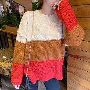 三色碰撞撞色拼接针织圆领套头毛衣