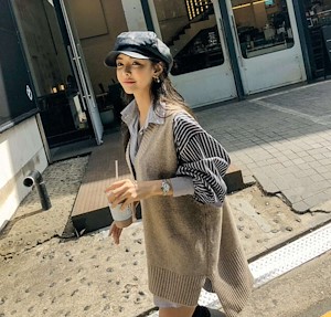 V领针织毛衣背心+条纹拼接衬衫裙 set