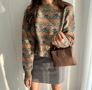复古田园小清新花花印花羊绒圆领套头毛衣