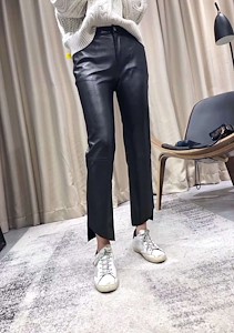 裤脚不规则裁剪直筒修身八分微加绒羊皮裤